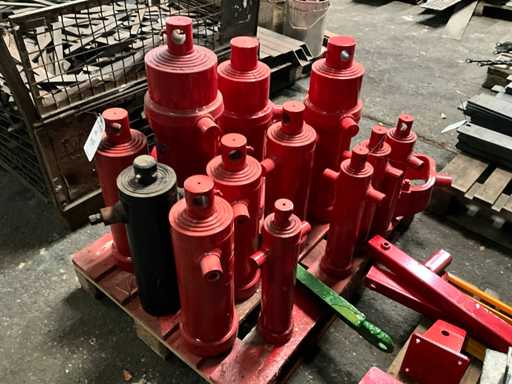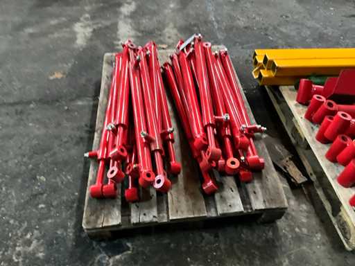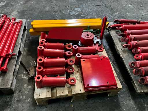 auf und mit 6 Paletten, darunter Lenkstangen (auch mit K50-Kugel), Platten, Lenkzylinder, Deichselzylinder, verschiedene mehrstufige Teleskopzylinder