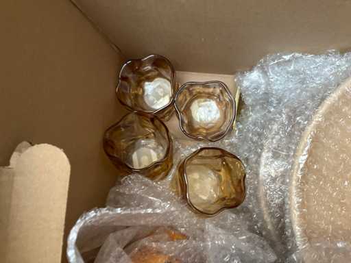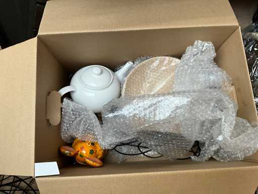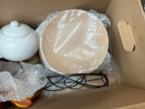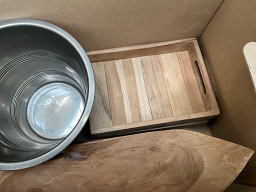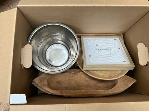 Bestehend aus: Holzschalen, Fotorahmen, 4x-Tablett, Metalltabletts, Teekanne, Glas, Steinschalen und Porzellanmaus