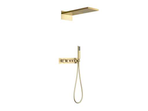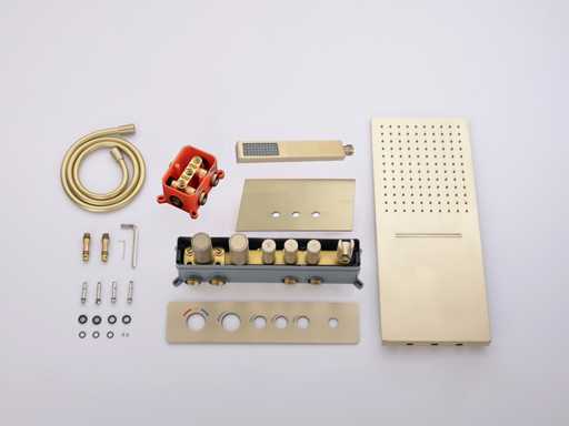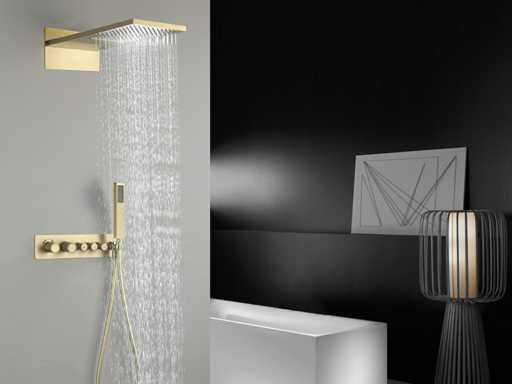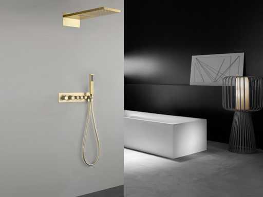 Farbwahl in 33 Farben, Edelstahl oder gebürstetes Gold oder mattes Schwarz (wählen Sie am Tag der Abholung angeben), Material Messing und Edelstahl 304, Mischbatterie, Keramik-Innenraum, Duschkopf L55xB23cm mit 2 Funktionen (Wasserfall + Regendusche), Handbrause mit Brauseschlauch und Messingaufhängung, Duschkopf mit Kunststoff-Wasserauslässen, Duschkopf neig- und schwenkbar, kalkschutzbehandelt, Messing-Wandplatte, dies ist ein neues Produkt in der Verpackung