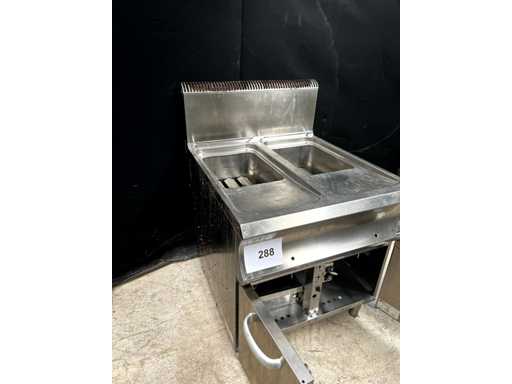 Gasfritteuse mit offenem Schrank und 2 × 18-Liter-Öltanks.