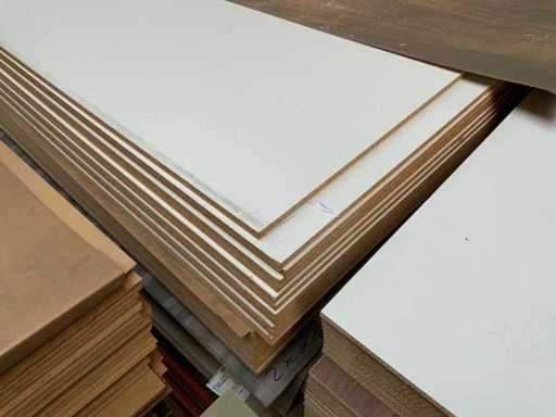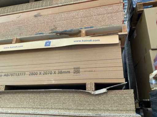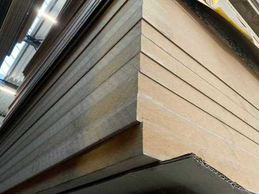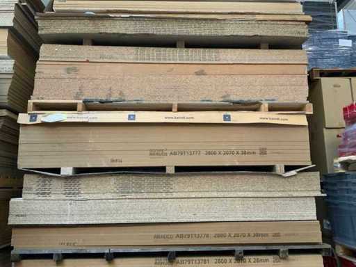 Die Platten sind ca. 2800x2070x20/28/38mm groß; Die Abmessungen können variieren; Dekorations-Spanplatten; einige doppelseitig laminiert; passt in 1 Tightliner; 8 Packungen; Stapel mit gelbem Aufkleber Nummer 8;