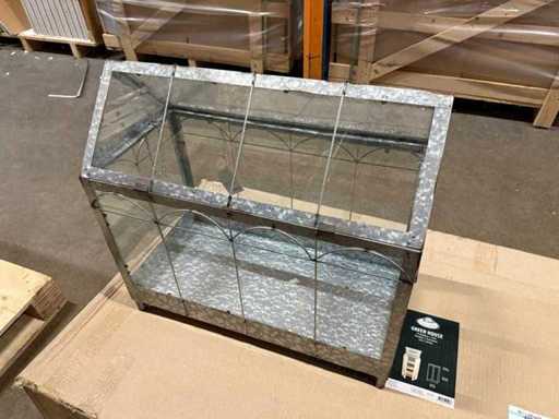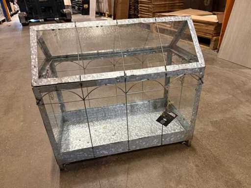 Dekorativer Metall-Mini-Gewächshaus-/Terrariumschrank mit Glaspaneelen, ideal zum Schutz oder zur Präsentation von Pflanzen. Die verzinkte Metallkonstruktion verleiht ein robustes und industrielles Aussehen. Die Oberseite ist faltbar für einfachen Zugang und gute Belüftung. Perfekt für einen Balkon, eine Terrasse oder drinnen als dekoratives Element. Ein robustes und stilvolles Stück für jeden Pflanzenliebhaber.