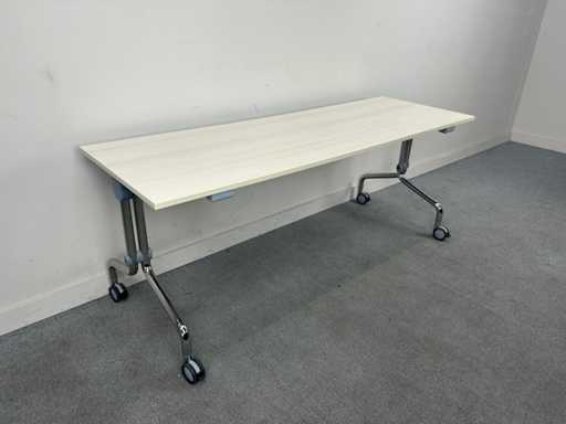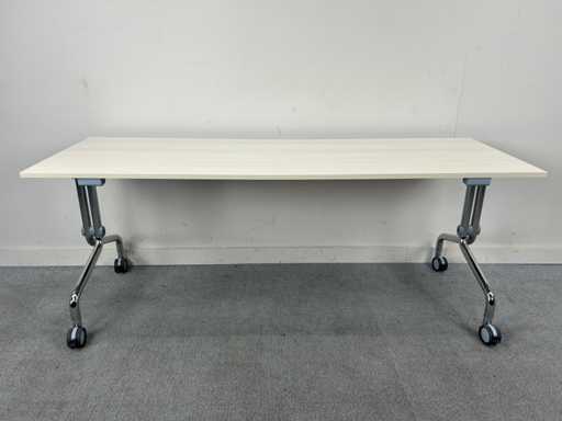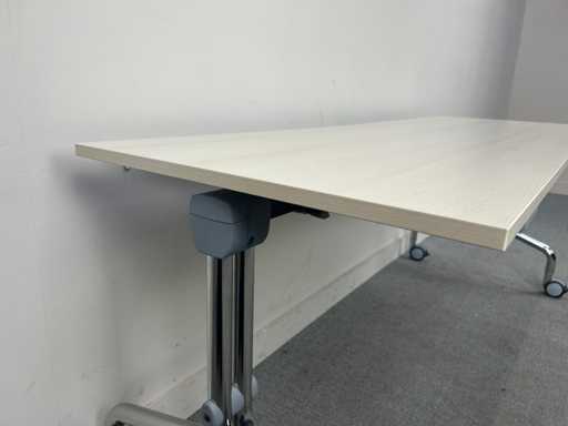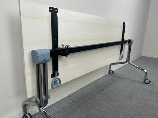 Praktischer mobiler Klapptisch / Trainingstisch mit hellem Holzlook und stabilem Metallboden. Ideal für Besprechungsräume, Trainings- und Bildungsräume oder als flexibler Arbeitstisch. Dank der mobilen Basis ist der Tisch leicht zu bewegen und kompakt zu lagern.