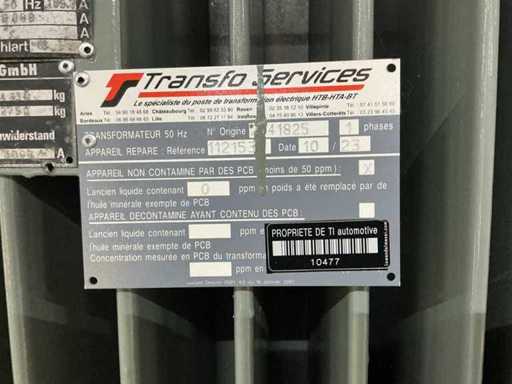 3 × 415 V, 6000 A, Ölgewicht: 2750 kg, Transformator im Oktober 2023 überholt. Mit dem Automation 2000 Schutzrelais auf Rädern.