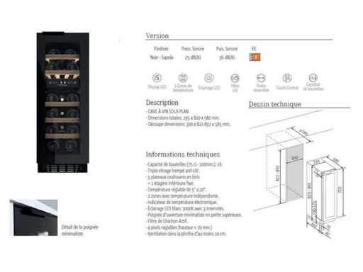 - Cave à vin Frecan neuf, sous plan, capacité de 16 bouteilles, 295 x 820 x 580 mm