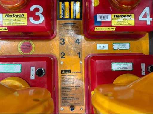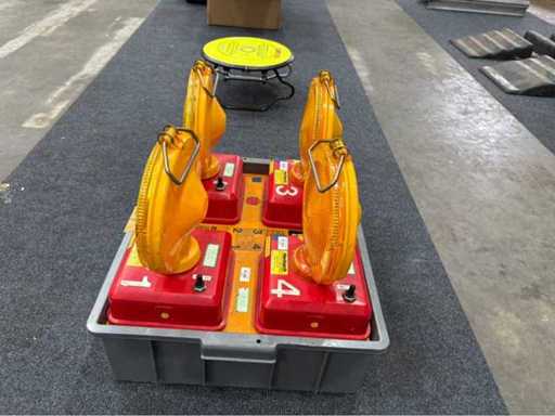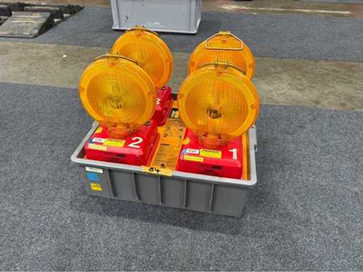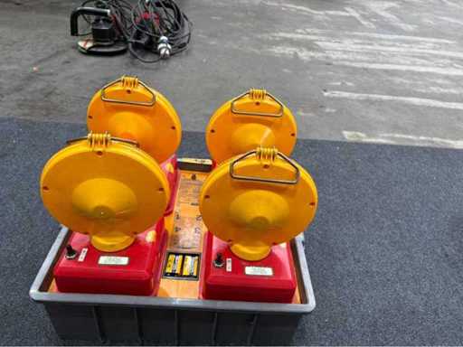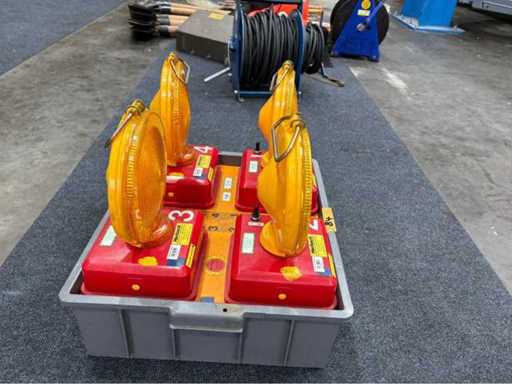 Komplettes Set Nissen-Richtungsleuchten (823 R-3 RQ) in robuster Transportbox mit Bedieneinheit. Ideal zur Verkehrslenkung oder Absicherung. Zwei Leuchten funktionsfähig, zwei mit unklarem Status. Batteriesystem und Zustand wie abgebildet. Ehemals im Einsatz bei Feuerwehr.