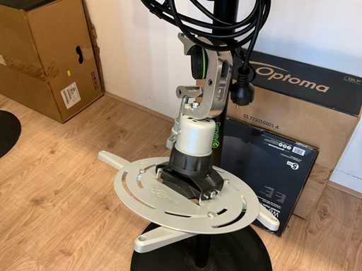 Ausgestattet mit Fernbedienung; Projektorhalterung mit Auslöseklemme; Stromkabel und 1 Projektionsstativ mit Plattform