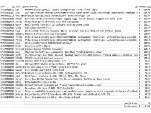 Dabei handelt es sich um eine Charge von zurückgegebenen A-Marken-Waren von einem großen Online-Händler. Die Charge besteht aus verschiedenen Produktkategorien. Anzahl der Stücke: 30. Verkaufswert: €4166,- Unkontrolliert: Betrieb unbekannt (Mischung von