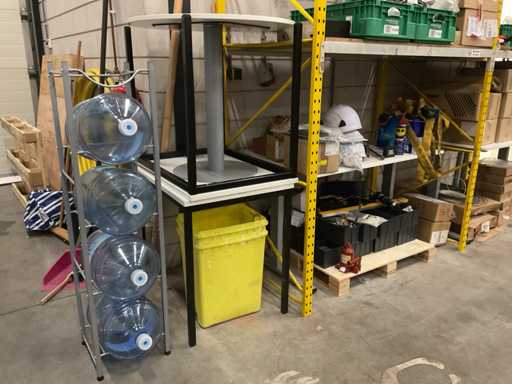 6x Ständer, 12x Balken, 6x Regal mit Inhalt, Behältern, 3x Tisch und Wasserflaschenhalter. Muss professionell auseinandergebaut werden. Schäden an der Immobilie werden vom Käufer übernommen.