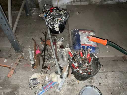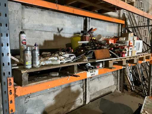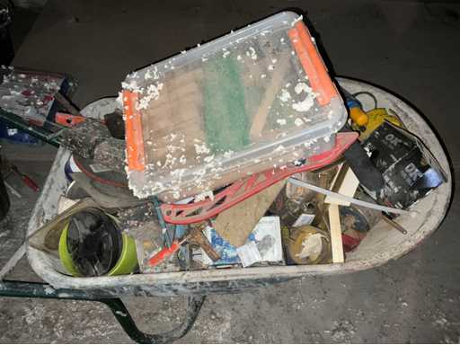 Der Inhalt besteht aus einer großen Charge von Befestigungselementen, Selicone, 3-facher Innentür, Schubkarre mit kleinen Handwerkzeugen usw.