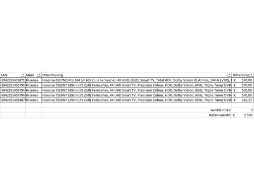 Dabei handelt es sich um eine Charge von zurückgegebenen Fernsehern von einem großen Online-Händler. Die Partei besteht aus verschiedenen Fernsehgrößen. Anzahl der Teile: . Verkaufswert: Die Fernseher funktionieren nicht und können als Ersatzteile verwendet werden. Kommen Sie am Vorstellungstag vorbei, um einen guten Eindruck vom Grund für Ihre Rückkehr zu bekommen. Siehe Fotos für die Inhaltsübersicht.