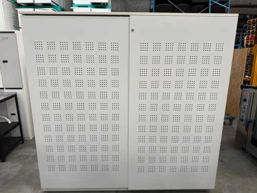 Robuster Metallaktenschrank im hellgrauen Design, ausgestattet mit zwei perforierten Schiebetüren zur Belüftung. Der Schrank ist mit mehreren verstellbaren Regalen ausgestattet und bietet ausreichend Stauraum für Akten, Ordner oder Materialien. Ideal für Büro, Archiv, Werkstatt oder technischen Raum.