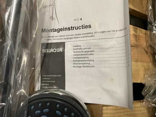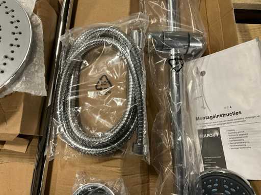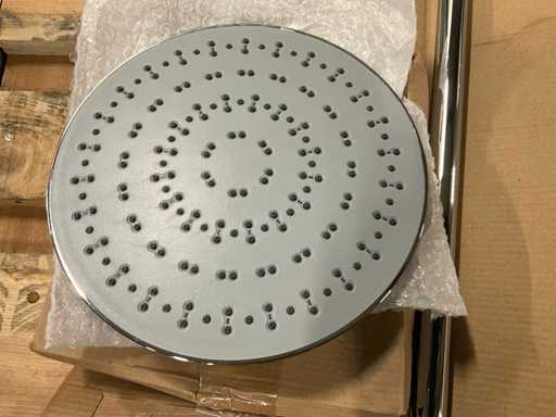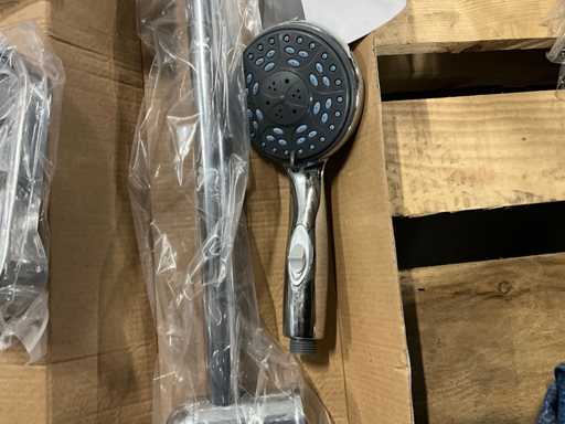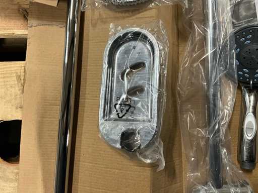 Dazu gehören ein Regenduschkopf mit Zufuhrstange, Handduschkopf mit Schlauch, Wandhalterung und verschiedene