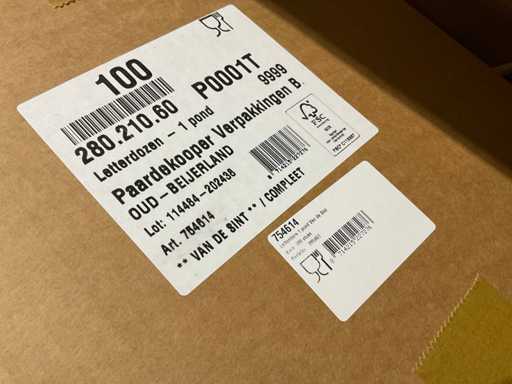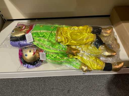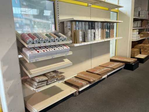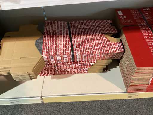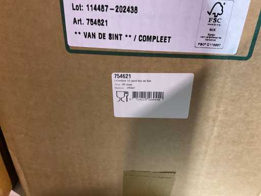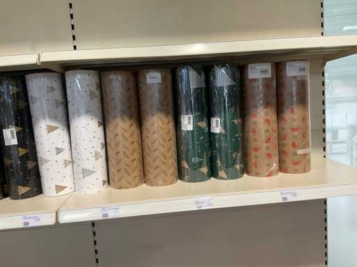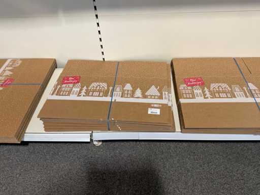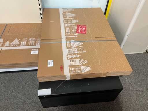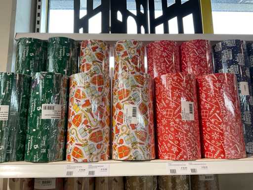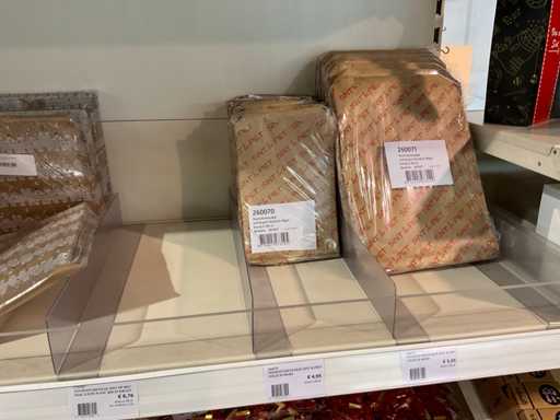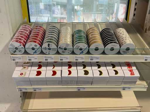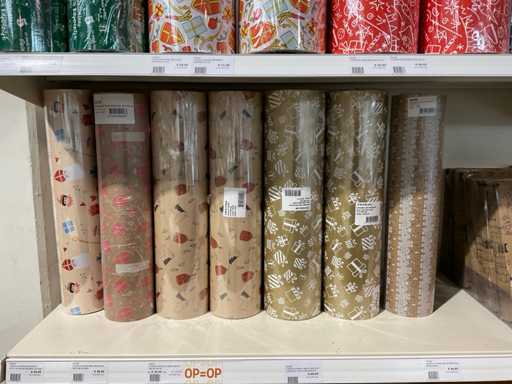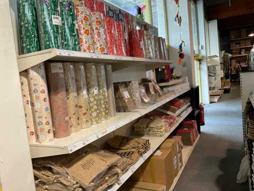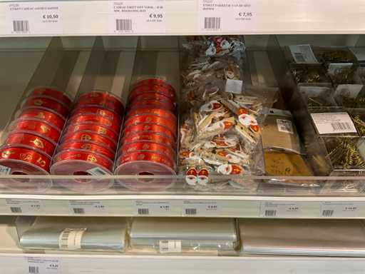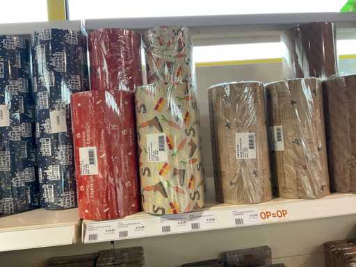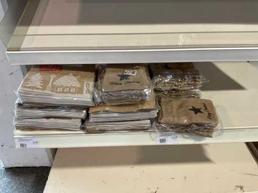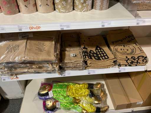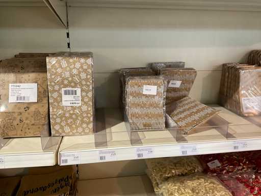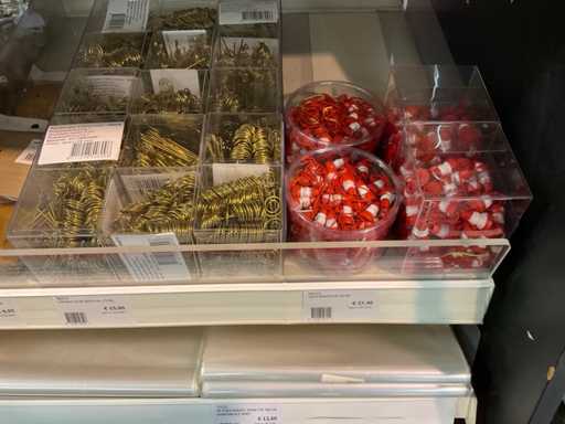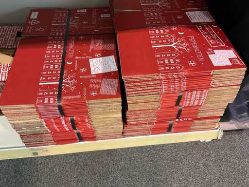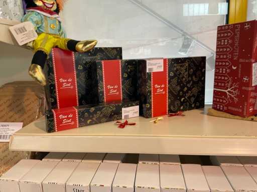 Bestehend aus Aufklebern, Bändern, Schleifenclips, Kurzwarentaschen, Geschenkpapier und Verpackungsschachteln. Thema Weihnachten und Sinterklaas. Ohne Rack.