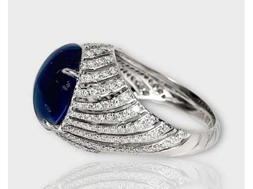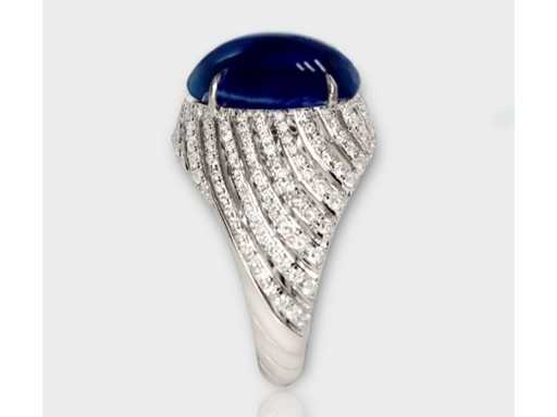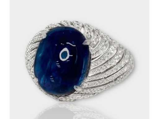 Prächtiger Hochschmuckring aus Naturblau Saphir 13,24 Karat aus 14 Karat Weißgold, Gesamtgewicht 7,48 gr., mit einer cabochonförmigen natürlichen blauen Saphir 12,04 Karat und 218 runden brillanten rosa Diamanten von 1,20 Karat. Zertifiziert von IGI Labaratoire, einem der weltweit größten unabhängigen Edelstein-Zertifizierungs- und Bewertungsinstitute. Weitere Informationen finden Sie im Zertifikat. Der Schmuck ist in Wirklichkeit besser als die Fotos. Einzelhandelspreis: 24.950 € – Neuer Schmuck.
