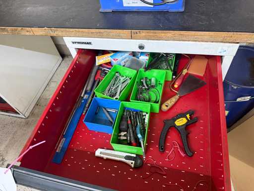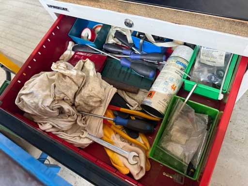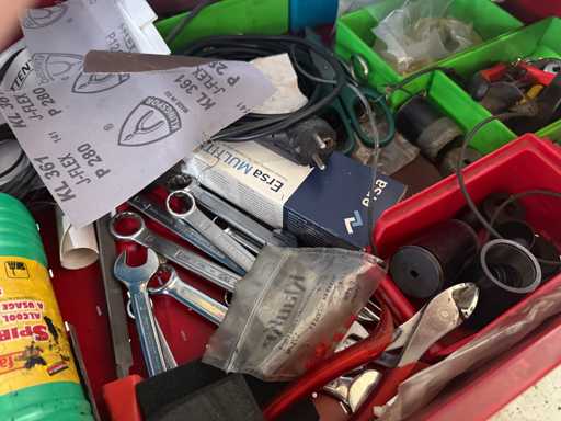 Inhalt bestehend aus Maulschlüsseln, Inbusschlüsseln, Spiralbohrern, diversem Handwerkzeug