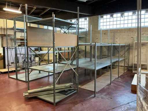 Abmessungen von etwa 8 Laufmetern bestehend aus 20 verschiedenen Aufrechten mit einer Höhe von etwa 1,50/2,20 m und 16 Regalen mit den Maßen ca. 1,00 x 0,80 m, komplett mit Ditto und den Maßen ca. 1,05 x 1,00 x 2,30 m mit 4 Regalen