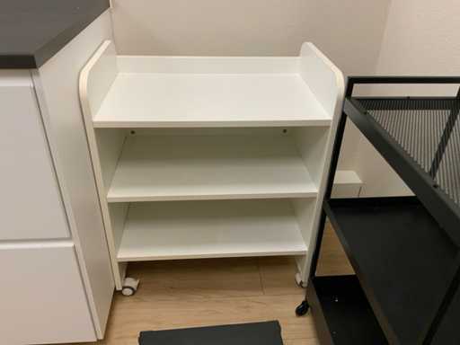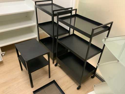 Verschiedene mobile Wagen, von denen einer Glasregale hat