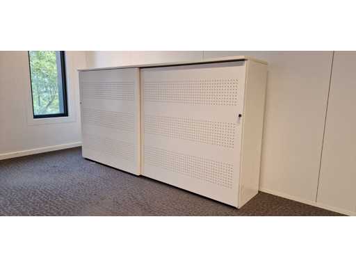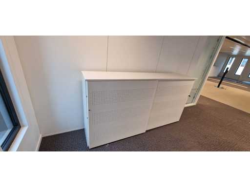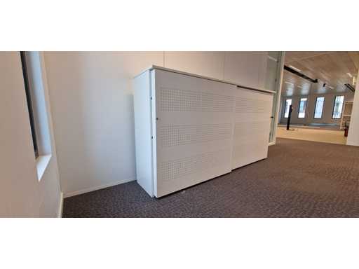 Schrank komplett in Metall weiß, Schiebetüren in Metall weiß mit akustischer Schaumfüllung schwarz, Oberdecke in Melamin weiß, mögliche Nutzungsspuren, leichte Verfärbungen durch UV-Exposition, Fotos zeigen an.