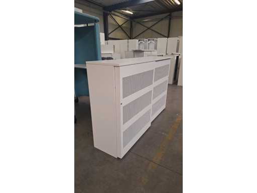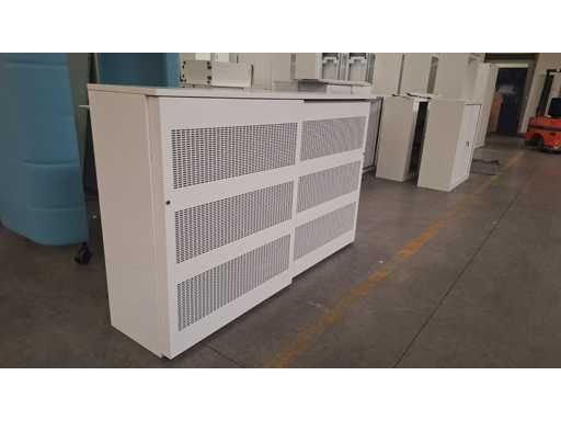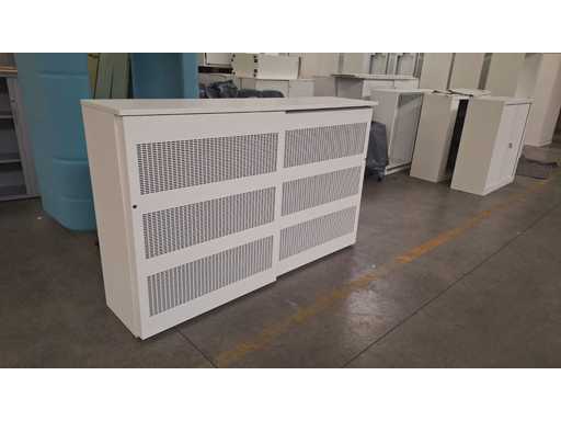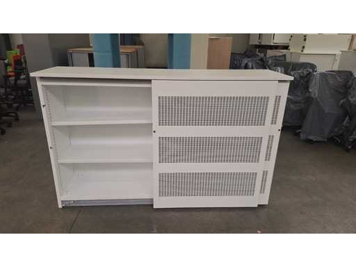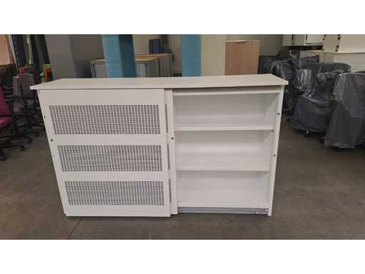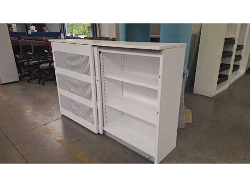 Gehäuse komplett in Metall Weiß, Schiebetüren in Metallfarbe Weiß mit Akustikfüllung, beide Seiten mit 2 Regalen in Metallfarbe Weiß, technisch in Ordnung, aber Gebrauchsspuren und fehlende Schlüssel