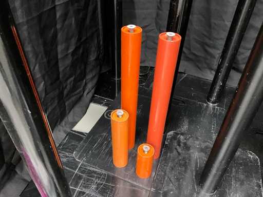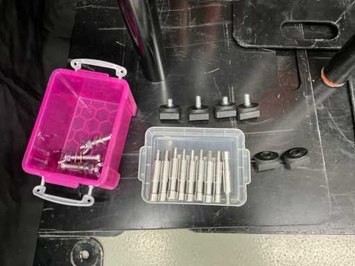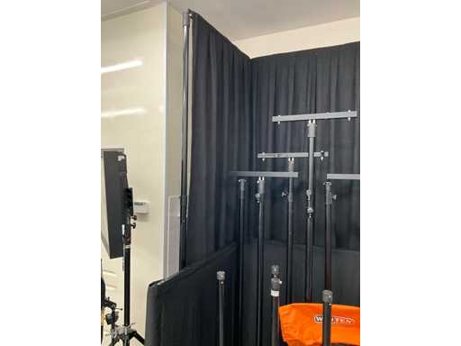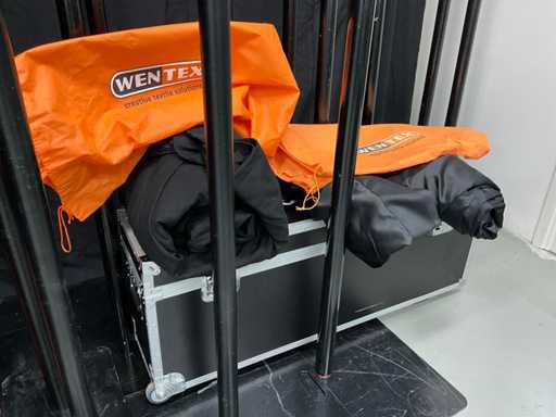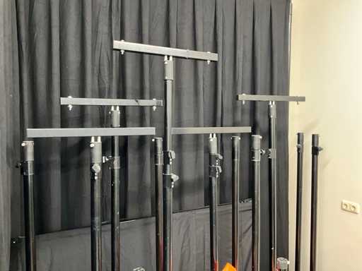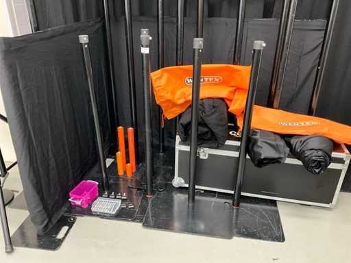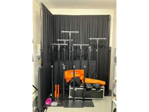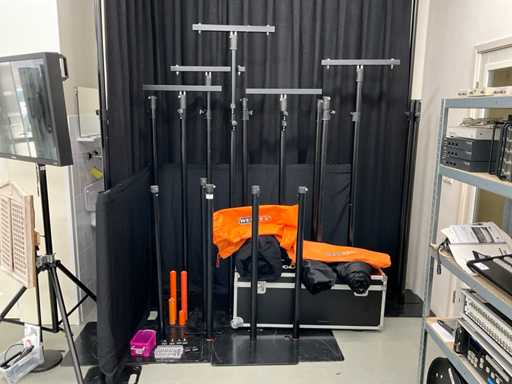 Bestehend aus 12 3-Meter-Teleskopständern; 3 4-Meter-Teleskopständer; 8 Teleskopständer 1,1 Meter; 26 Beine; 4 Bodenplatten 45x45 cm; 8 Bodenplatten 35x30 cm und Bodenplatten 60x60 cm; 5 Teleskoptraversen à ca. 120 bis 180 cm; 5 Schlepplifte; 2 Leinwände "Wentex" 300x110 cm; 2 Molton 300x300 cm Tücher; 2 Satin 300x300 cm; 1 Flightcase; 9 Rohr- und Abdeckstifte und 4 Ersatzschrauben; 2 Balkenschrauben und 2 Aufbewahrungstaschen