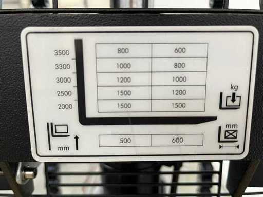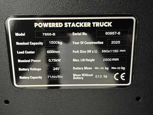 internes Ladegerät; Notstopp; Batterieanteil; Doppelkette; Notfallknopf; Ladezentrum 600 mm; Nennleistung 0,75 kW; Batteriespannung 24V; 71 Ah/5 Stunden; Löffel Größe 560x1150mm