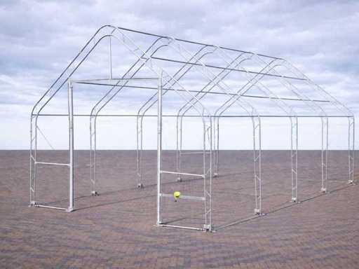 PVC-Abdeckung 420 Gramm; Seil zum Ziehen in beide Richtungen; Tor-Höhe 3,05 M; Torbreite 3,66 m; Einfaches Fachwerksystem verzinkt; Bogenraum 2,44 M; ungenutzt; in einer Metallbox;