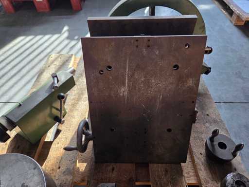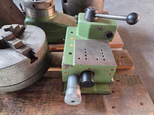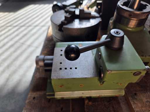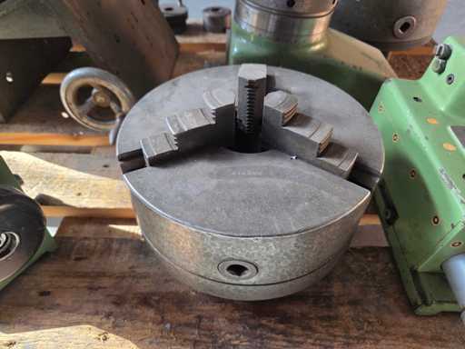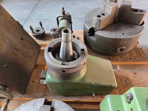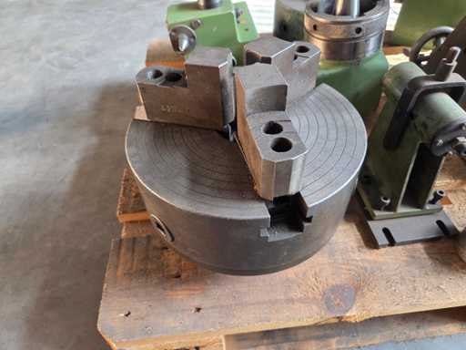 Futterhersteller: SkandChuckfabriks AB SCHWEDEN, 1x Stahl 3-Backenfutter Ø 230 mm, Gewicht 25 kg, Bohrung 65 mm, Qualitätsstahl, 1x Stahl 3-Backenfutter Ø 265 mm, Gewicht 46 kg, Bohrung 65 mm, hochwertiger Stahl, 1x Reitstock mit Schauglas, 1x fester Sitz, 2x Fräsmaschinenteil