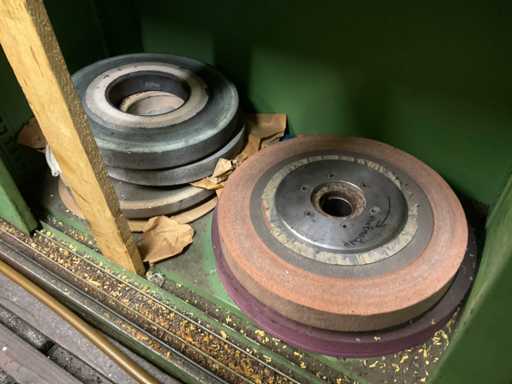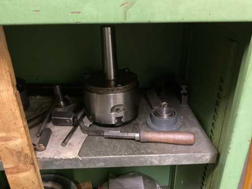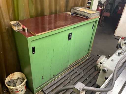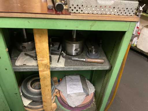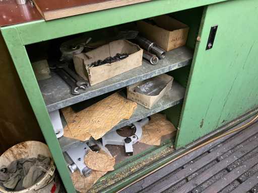 Schrank mit Schiebetüren, mit Inhalt bestehend aus: u.a. Lünette , 3-Backenfutter, div. Schleifscheiben, div. Maulschlüsseln, vermutlich zugehörig zu Lot 25