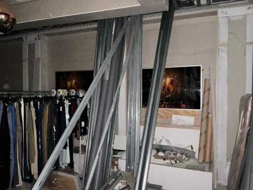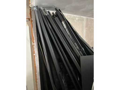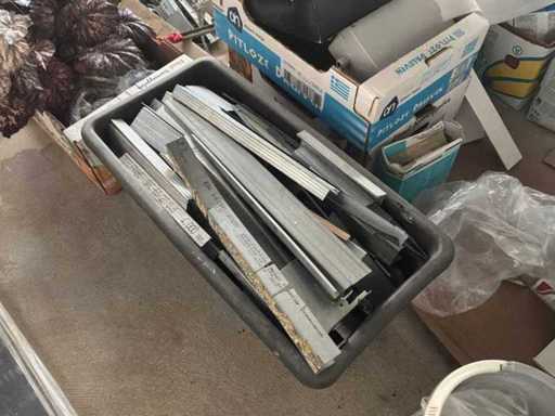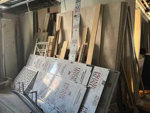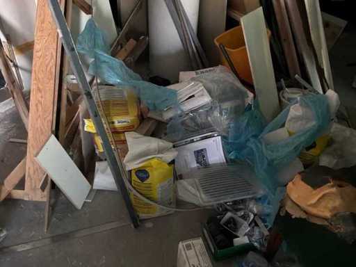 Bestehend aus: Metallprofilen, Stangen, Säcken mit Betonmörtel, Befestigungselementen, Halterungen, Holzplanken, Paneelen, Werkzeugkisten, Teilen, Kisten mit Kabeln, Kleinmaterial, Lampen, Armaturen und verschiedenen anderen Baumaterialien.