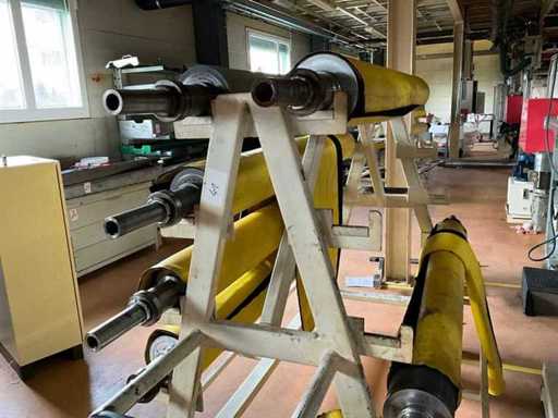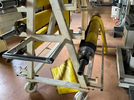 Schwerer Walzenwagen / Rollenträger für Druck- oder Gummiwalzen, geschweißter Stahlrahmen auf 4 Lenkrollen, mit mehreren Aufnahmen für Walzenzapfen, Abmessungen ca. 2,4 × 1,0 × 1,4 m (L×B×H), leer, ohne Walzen, gebrauchter Zustand mit Lackspuren, gut geeignet für Lagerung und Transport von Walzen in Druckerei oder Folienverarbeitung;