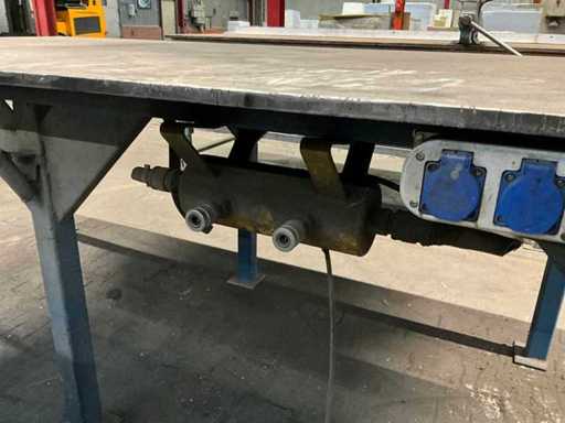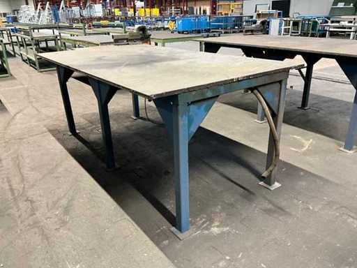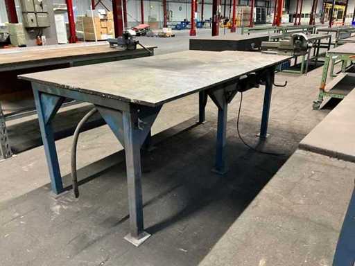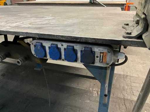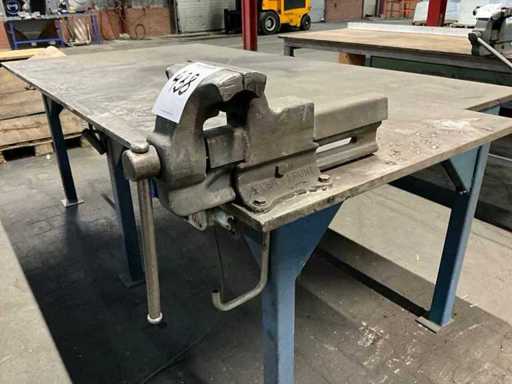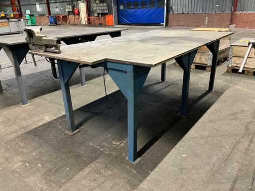 Profil-Stahlsockel; Stahltischplatte; Stahltischdicke 20 mm; Tischgröße 2350x1250 mm; Tischhöhe 900 mm; ausgestattet mit Heuer Vice Kieferbreite 150 mm; ausgestattet mit einem Luftverteileranschluss; Stromanschluss.