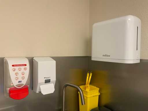 Bestehend aus Papierspender, Seifenspender und Handdesinfektionsspender aus 4 Behandlungsräumen