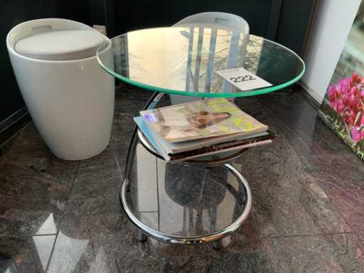 Bestehend aus 2 Hockern und einem Glastisch ø 50 cm, Höhe ca. 52 cm.