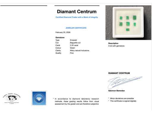 Edelstein: Smaragd; Menge: 7 Stück; Schnitt: Baquette-Schnitt; Gewicht (Karat): 2,22 Karat; Farbe: Grün; Reinheit: Viele natürliche Einschlüsse; Schnitt: Wunderschön; Zustand: Neu; Verpackung: Gem Box; Erklärung: Die Qualität wurde aus dem Bericht übernommen, der zum Artikel gehört. Die Bewertung ist eine Bewertung eines zertifizierten Diamanthändlers, basierend auf Verbraucherpreisen; Zusätzliche Informationen: Jardin, natürlich frei wegen der Einschläge; Verbraucherpreis: 1.650 €