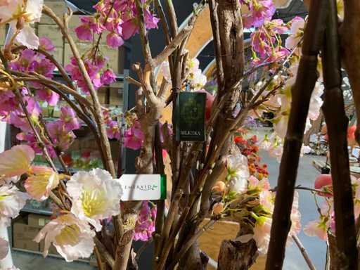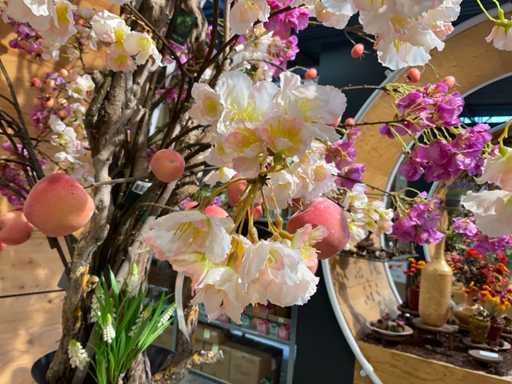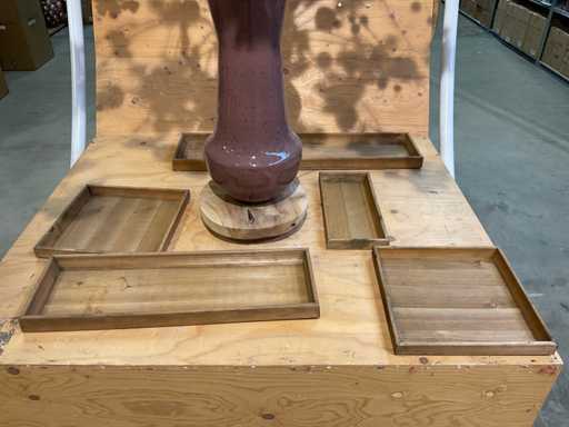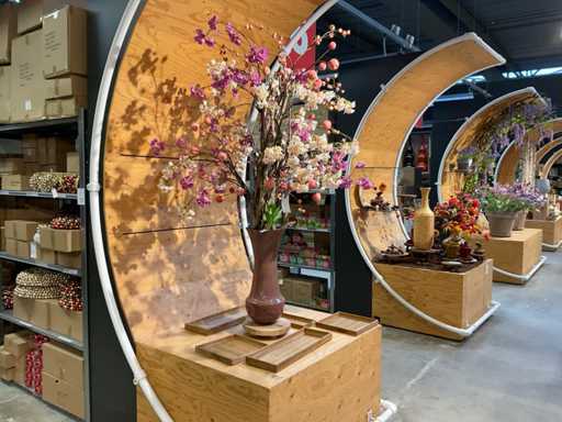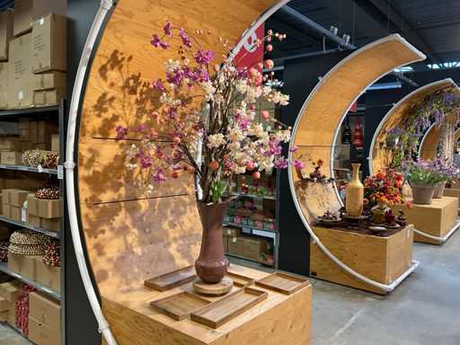 Vasendurchmesser ca. 30 cm, Höhe ca. 60 cm, inklusive Holztabletts in der Ladenauslage.