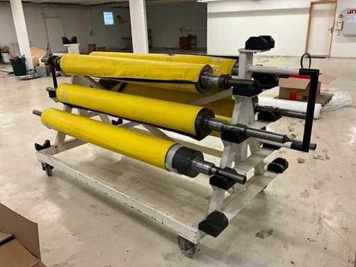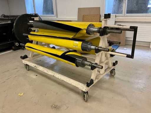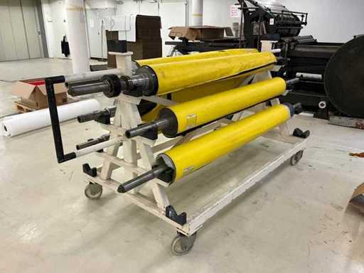 Schwerer Walzenwagen / Rollenträger für Druck- oder Gummiwalzen, geschweißter Stahlrahmen auf 2 Lenkrollen + 2 starre Rollen, mit mehreren Aufnahmen für Walzenzapfen, Abmessungen ca. 2,4 × 1,0 × 1,4 m (L×B×H), leer, ohne Walzen, gebrauchter Zustand mit Lackspuren, gut geeignet für Lagerung und Transport von Walzen