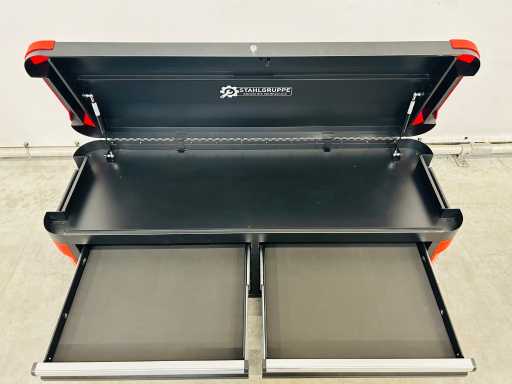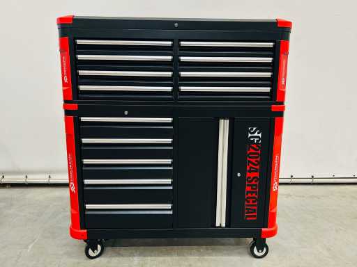 Wagen mit abnehmbarer Topbox; Oberer Kasten mit 8 Schubladen und oberem Deckel; Wagen mit 5 Schubladen und Schrank mit Doppeltüren; 13 Schubladen – 9 gefüllt; 2 Drehräder, von denen 2 gebremst sind; 7212