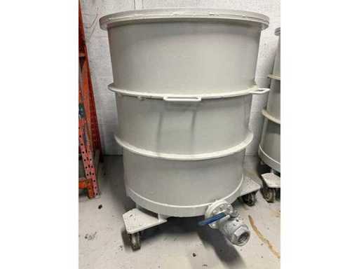 Fassung: 900 L pro Tank Menge: 2 Einheiten Material: Lackierter Stahl Konfiguration: Vertikale zylindrische Panzer mit peripheren Verstärkungen Mobilität: Auf Rollen mit Stützplatten montiert Entwässern: Kugelventil mit Gewindeverbindung am unteren Rand Ausrüstung: Handhabung von Seitengriffen