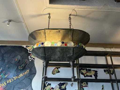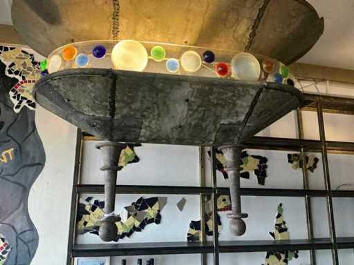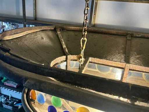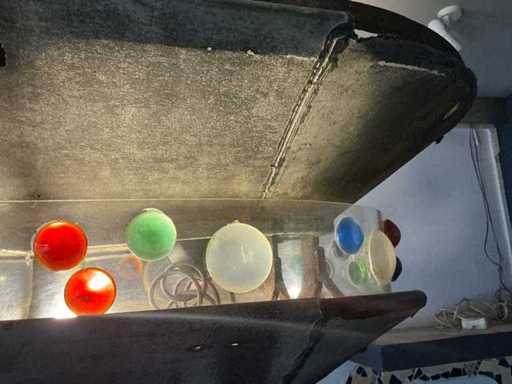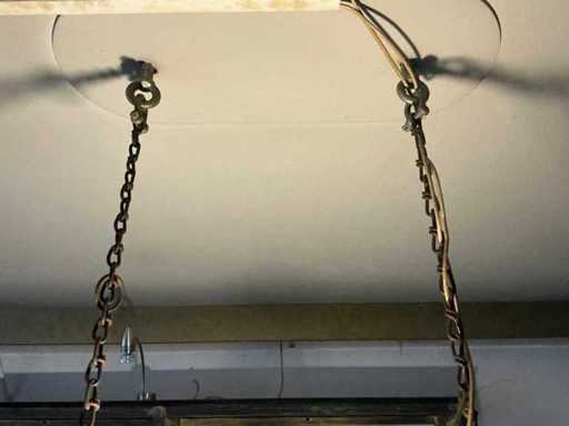 Stahllampen mit Kunststoffkante und Holzboden. Lampen hängen in einer Höhe von etwa 4 Metern, der Käufer muss sein eigenes Material bereitstellen, um es in Höhe zerlegen zu können.