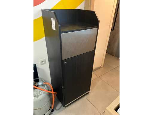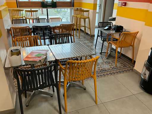 Bestehend aus 6x quadratischen Edelstahltischen mit den Maßen 60x60x72 cm, + 16 x passenden Kunststoffstühlen in zwei Farben Gelb und Schwarz, + 4x Barhocker in Plastik in Gelb, + Aufbewahrungsschrank mit Müllluke, +1x Hochstuhl