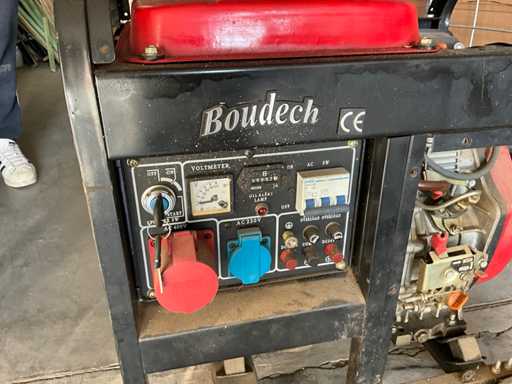 Marke: Boudech Typ: Professioneller Generator (Benzin) Ausgänge: AC 400V (Drehstrom, rote Steckdose) AC 230V (blaue Steckdose) DC 12V & DC 24V Anschlüsse (geeignet für Batterien) Voltmeter: Analoges Voltmeter verfügbar Bedienfelder: Hauptschalter (AC SW) Überlastschutz (Sicherungen + Reset-Tasten) Stundenzähler Startschalter (Schlüsselstart verfügbar) Kraftstofftank: Oberer Metalltank (rot) Motor: Benzinmotor (manueller und elektrischer Start sichtbar) Rahmen: Stahlrahmen mit Rädern und Griffen für Mobilität Fähigkeit Die genaue Leistung ist auf dem Foto nicht zu sehen, aber Boudech-Generatoren dieses Typs liegen in der Regel bei 5,5 – 6,5 kW (5500–6500 W) und eignen sich sowohl für Baustellen als auch für Notstrom.
