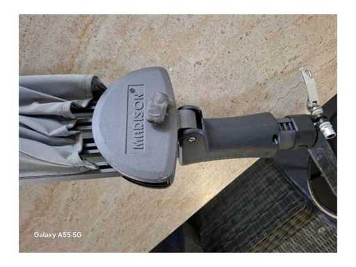 Die Sunwave hat viele Möglichkeiten. Die Höhe ist verstellbar und er kann sich in mehr als 80 Positionen nach hinten neigen, sodass er als Sonnenschirm oder als Schattentuch dienen kann. Der Stoff besteht aus 210 g Polyester mit PA-Beschichtung, wodurch der Stoff wasser- und schmutzabweisend ist.