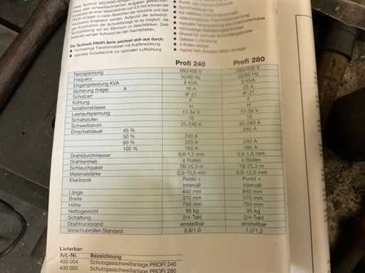 Technische Daten – Technolit Schutzgasschweißanlage PROFI 240: