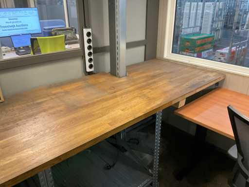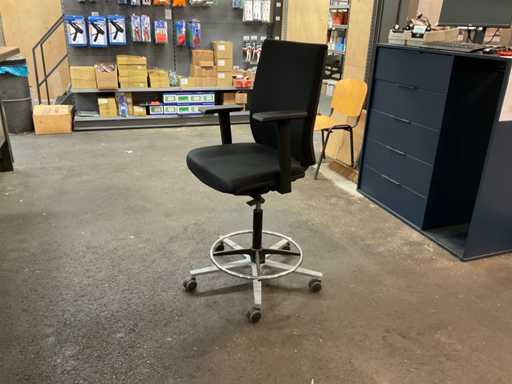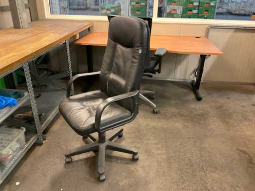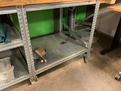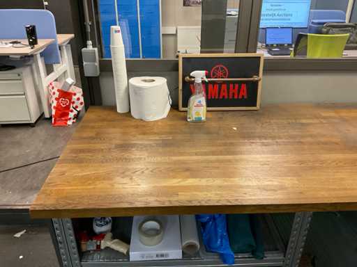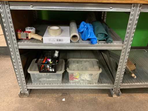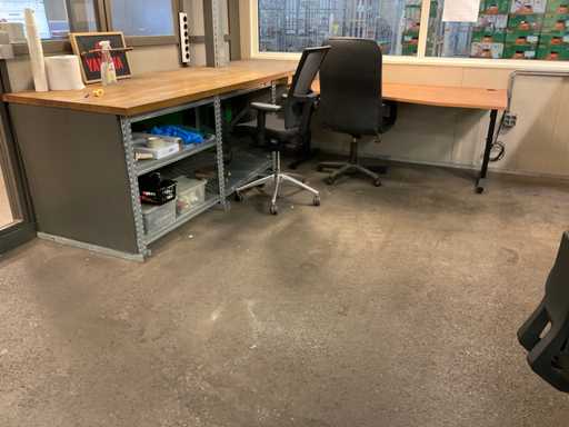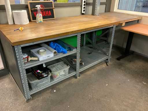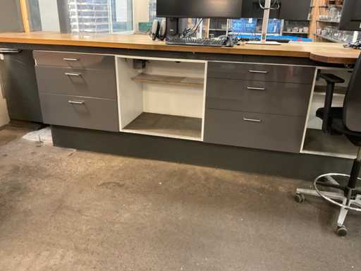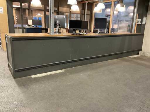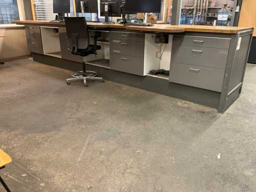Bestehend aus großer Theke, ca. 600x90x110 cm v.v. an Schubladen und Fächern, inkl. Hochhocker, Schreibtischtisch ca. 100x80x76 cm inkl. 2 Bürostühle, Werkbank ca. 280x90x90 cm mit Inhalt, inkl. Deckenbeleuchtung.