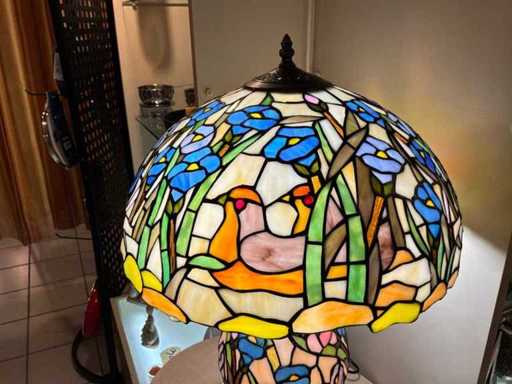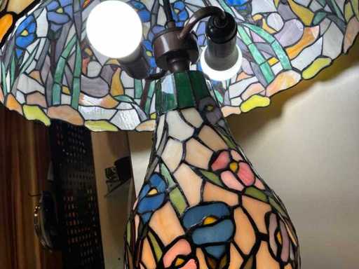 Wunderschöne Art Nouveau Tiffany-Lampe mit mehrfarbigem Schirm sowie floraler Dekoration und Beleuchtung im Tiffany-Sockel