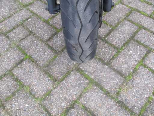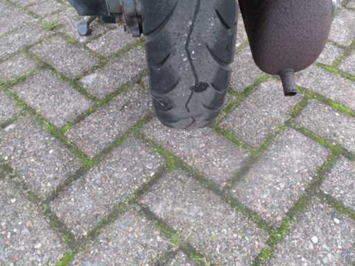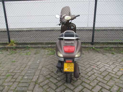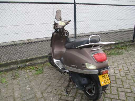 Moped-Roller mit zwei Schlüsseln, darunter niedrige Windschutzscheibe, Aluminium-Trittbretter und hintere Gepäckträger. Der Roller steht schon seit einiger Zeit still und muss neu gestartet werden (die Kompression fühlt sich normal an), weiterer technischer Zustand ist unbekannt.
