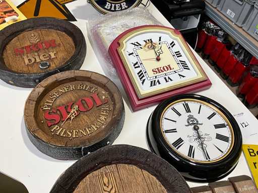 Viele verschiedene Werbeartikel. Zum Beispiel Stol-Bier, Hoegaerdse Das und Oranjeboom. Außerdem ein paar Metallschilder.