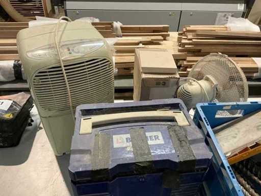 Bestehend aus einer PVC-Lagerbox mit verschiedenen Dichtungen und Kupplungen,... Handsäge, verschiedene Bohrer, Chargenkacheln, Ventilator und Luftentfeuchter