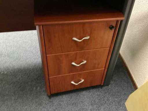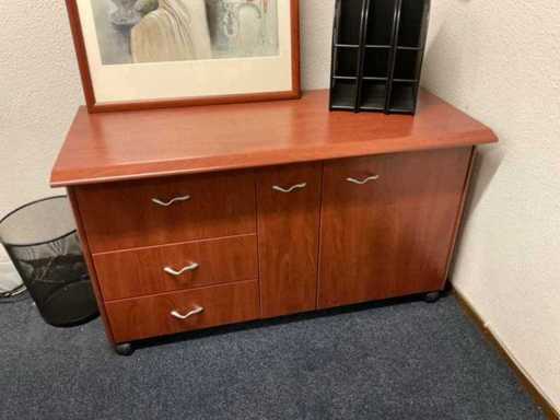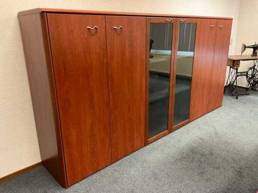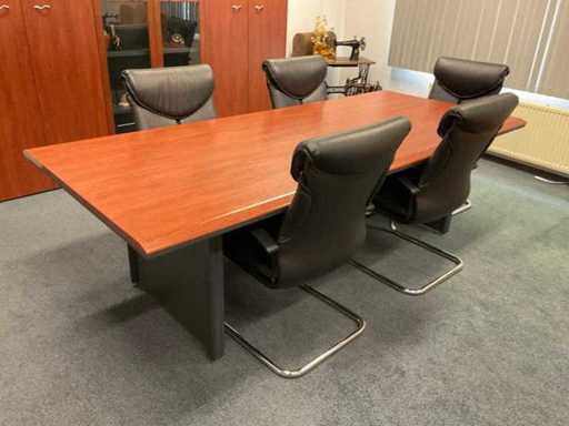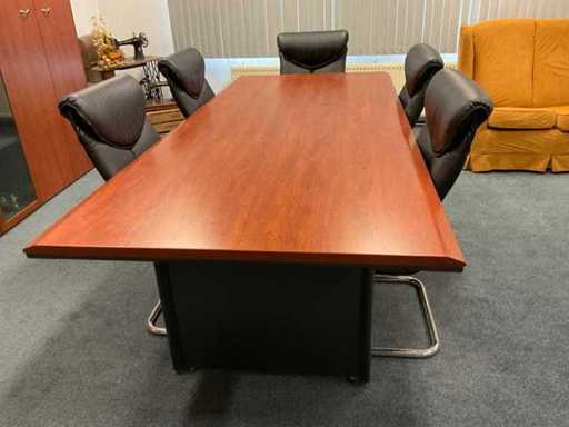 Bestehend aus: (1x) Schreibtisch 2000x900x740mm, (1x) Wandschrank 1150x550x660mm, (1x) Wandschrank 2770x470x1370mm, (1x) Konferenzset mit (1x) Tisch 2500x1100x760mm, (5x) Konferenzstühlen.